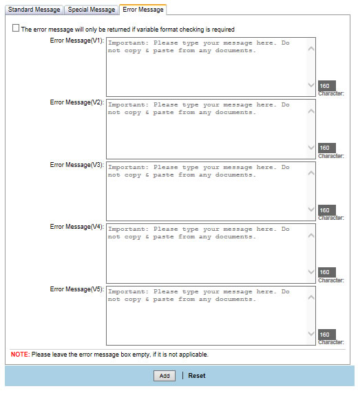 - By default, if no error message is entered for each variable, a standard error message will be returned once an invalid MO is received from the mobile user.